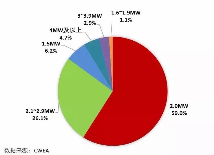 2017年,中国新增风电机组中,2MW以下(不含2MW)新增装机容量市场占比达到7.3%,2MW风电机组装机占全国新增装机容量的59%,2MW至3MW(不包括3MW)新增装机占比达到85%。3MW至4MW(不包括4MW)机组新增装机占比达到2.9%,4MW及以上机组新增装机占比达到4.7%。