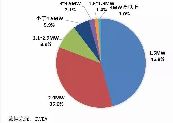 与2016年相比,变化幅度较大有,2.1MW至2.9MW机组市场份额增长了11%;1.5MW机组市场份额下降了11%至6.2%。