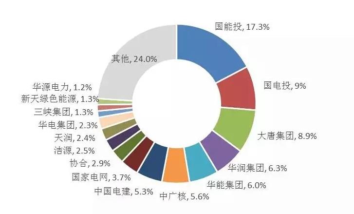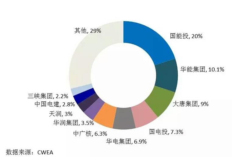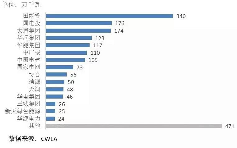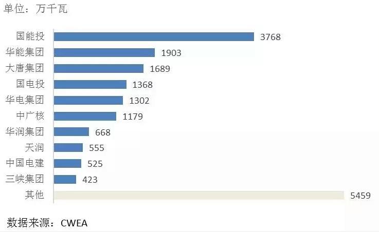2017年,中国风电有新增装机的开发企业共80多家,前十五家装机容量合计接近1500万千瓦,占比达到76%。截至2017年底,前十家开发企业累计装机容量合计超过1.3亿千瓦,占比达到71%。