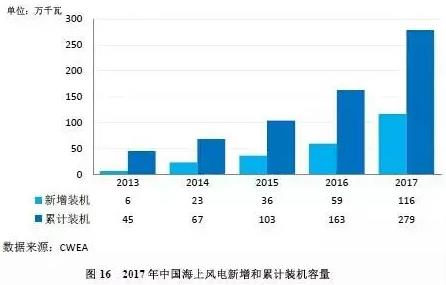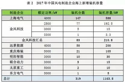 2017年,中国海上风电取得突破进展,新增装机共319台,新增装机容量达到116万千瓦,同比增长97%;累计装机达到279万千瓦。2017年共有8家制造企业有新增装机,其中,上海电气新增装机容量最多,共吊装147台,容量为58.8万千瓦,占比达到50.5%。