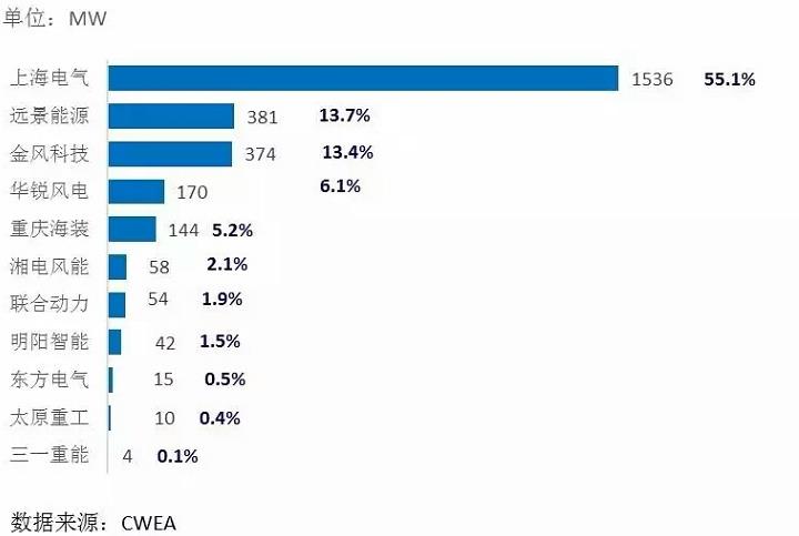 截至2017年底,海上风电机组整机制造企业共11家,其中,累计装机容量达到15万千瓦以上有上海电气、远景能源、金风科技、华锐风电,这4家企业海上风电机组累计装机量占海上风电总装机容量的88%,上海电气以55%的市场份额遥遥领先。