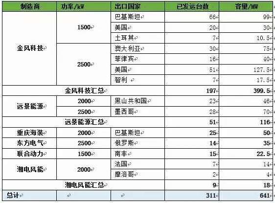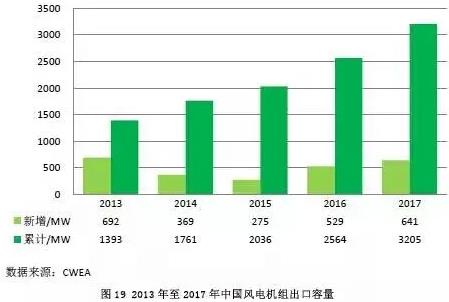2017年,中国向国外出口风电机组311台,容量641MW,同比增长21%。截至2017年底,中国风电机组制造企业已出口的风电机组共计1707台,累计容量达到3205MW。