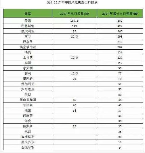 截至2017年底,中国风电机组累计出口到33个国家,较2016年新增加5个国家(包括墨西哥、黑山共和国、菲律宾、法国和摩洛哥);其中向美国出口的风电机组容量最多,占出口总容量的17%。其次是巴基斯坦、澳大利亚、南非,出口占比分别为13%、11%和9%。