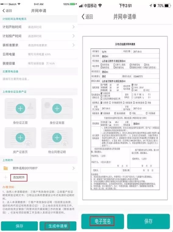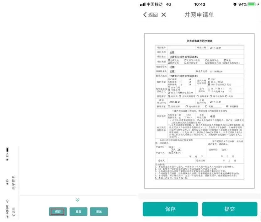 4、查看并网申请单,点击【电子签名】对申请单进行签字确认,点击【保存】后点击【提交】,完成并网申请。