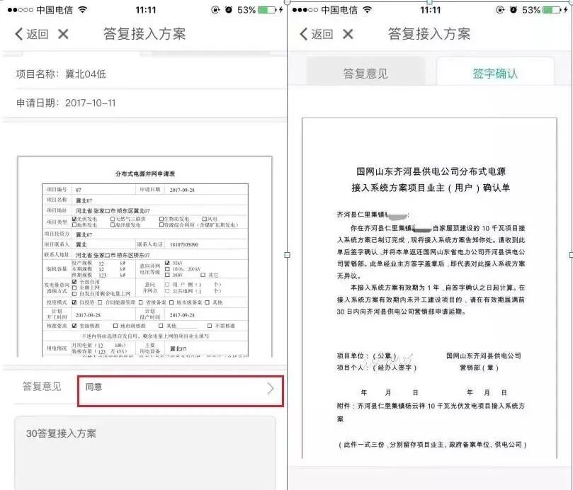 7、查看接入方案,填写【答复意见】后,点击【签字确认】,进行【电子签名】后点击【保存】【提交】。