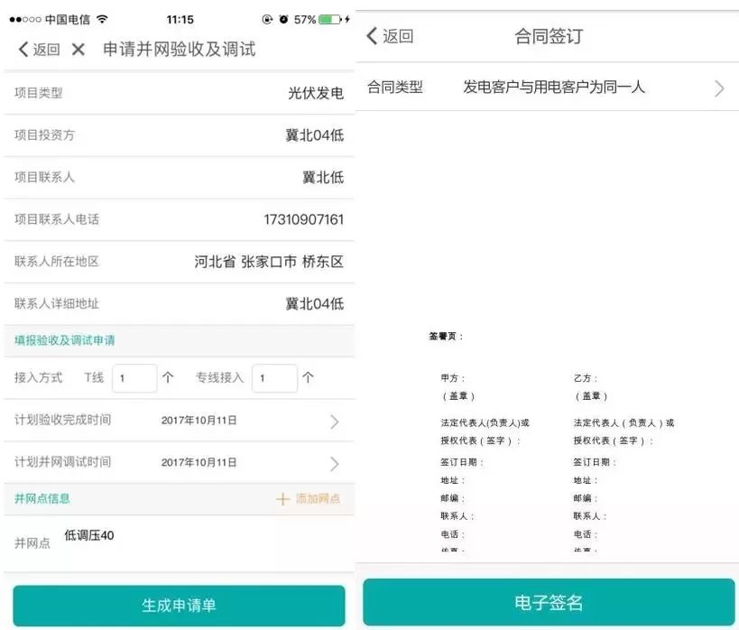 8、电力公司完成接入方案确认后,用户可进入【光e宝】-【线上并网】,点击相应项目,点击【申请并网验收及调试】环节,填写并提交并网验收申请;电力公司完成合同起草后,用户可点击【合同签订】环节,查看合同文本并进行签字确认。