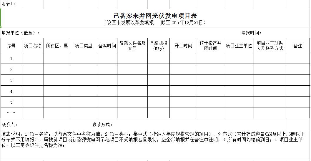 4、请各设区市发展改革委负责汇总辖区内2017年底前已备案未并网光伏项目情况,按附表1格式要求填报(具体要求见附表填报说明)。