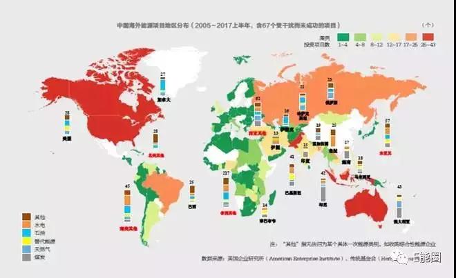 中国海外能源项目涉及几乎所有的能源种类,在2005~2016年经济总额6065亿美元中,石油、煤炭、水电、天然气、替代性能源技术(如可再生能源、新能源汽车等)占比分别为23%、17%、14%、13%和5%。此外,还包括一批无法归为某一具体能源类别的项目,例如,2011年中国投资有限公司斥资32.4亿美元收购法国燃气苏伊士集团30%的股份,后者业务包括天然气和电力两个板块;2012年中海油以151亿美元收购加拿大尼克森公司,后者业务包括石油和天然气两个板块。