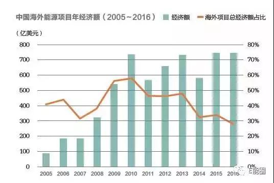 能源领域是中国企业“走出去”的最重要阵地,年经济额从2005年的83亿美元增长至2010年的738亿美元,并长期维持在较高水平,2016年为746亿美元。2005年至2017年上半年,项目数量总计748个,占中国企业海外项目总数的30%,其中直接投资项目309个,建设合同439个;经济总额达到6300亿美元,占海外项目总额的38%。