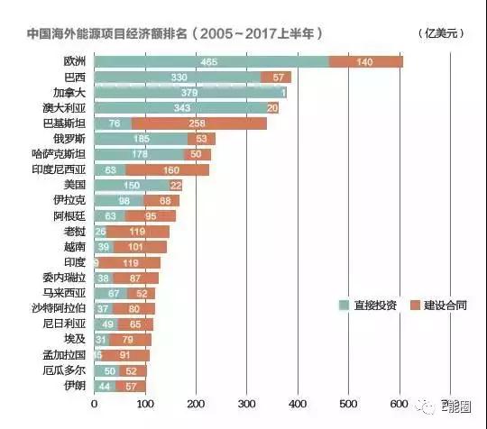 巴西、加拿大、澳大利亚、巴基斯坦是海外能源项目经济额最高的国家,均超过300亿美元。直接投资方面,加拿大、澳大利亚、巴西、俄罗斯、哈萨克斯坦、美国均超过150亿美元,分别为379亿、343亿、330亿、185亿、178亿和150亿美元;建设合同方面,巴基斯坦、印度尼西亚、老挝、印度、越南均超过100亿美元。中国在任何一个欧洲国家的能源项目经济额均未超过100亿美元,但在整个欧洲地区的直接投资达465亿美元,建设合同达140亿美元。