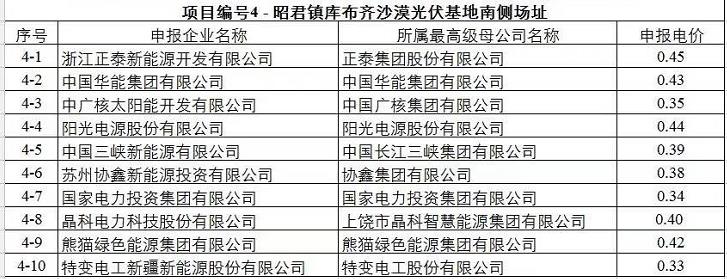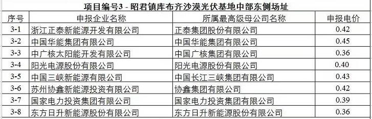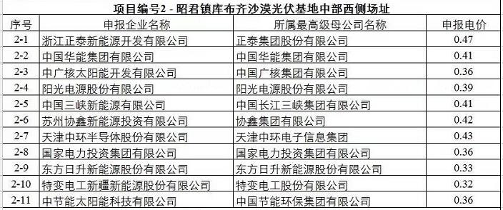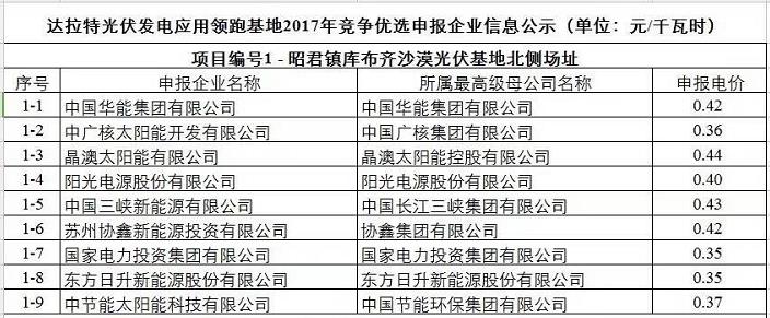 达拉特光伏发电应用领跑基地2017年竞争优选申报企业信息公示(单位:元/千瓦时)