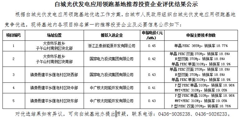 白城光伏发电应用领跑基地推荐投资企业评优结果今日公示。