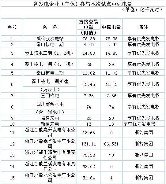根据《浙江省电力用户与发电企业直接交易试点实施方案(试行)》(浙经信电力〔2014〕453号)和《2017年度浙江省电力直接交易试点工作方案》(浙发改能源〔2018〕44号)相关规定,浙江电力交易中心在北京电力交易中心、国家电网华东分部的协助支持下,于2018年2月7日组织了浙江2018年度电力直接交易试点平台集中竞价,经相关单位部门规范性审查和安全校核,现将竞价结果公告如下: