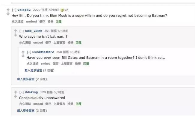比尔盖茨没有回答这个问题。但网友评论也很精彩:“谁说他不是蝙蝠侠了?”还有人说,“你看到比尔盖茨和蝙蝠侠同时出现过吗?没有吧。。”