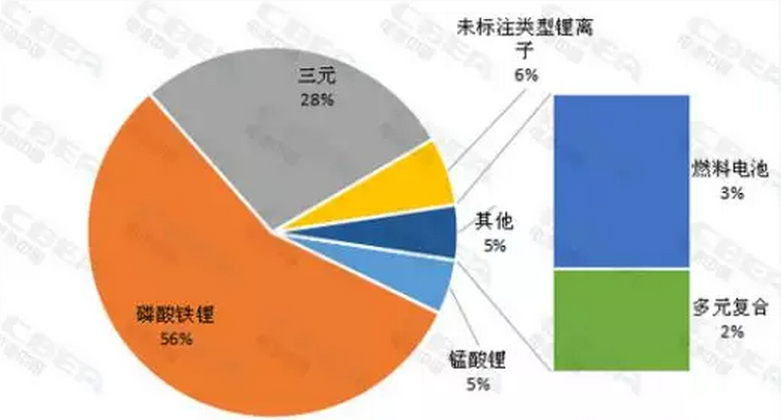 在电池类别配套方面,还是以磷酸铁锂为主流,配套94款车型,占比达56%;三元电池47款,占比28%;锰酸锂电池8款,占比5%;未标注类型锂离子电池10款,占比6%;燃料电池车型5款,占比3%;多元复合电池只有3款车型,占比2%。