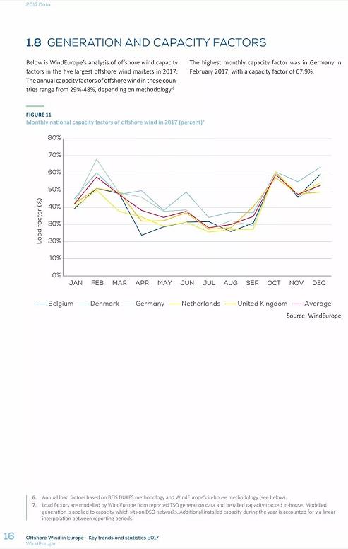 新建风场海上风机平均容量5.9MW,比2016年的4.8MW增长23%;新建海上风场平均容量493MW,比2016年的368MW增长34%;容量系数也在增长,其中英国Dudgeon风场的容量系数最高,为65%。