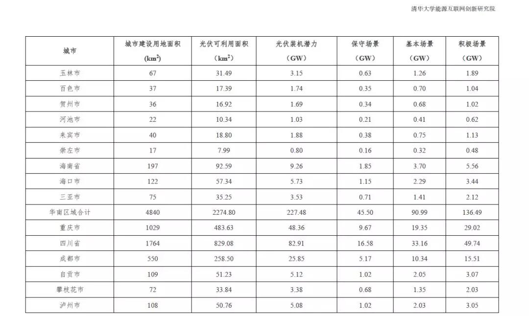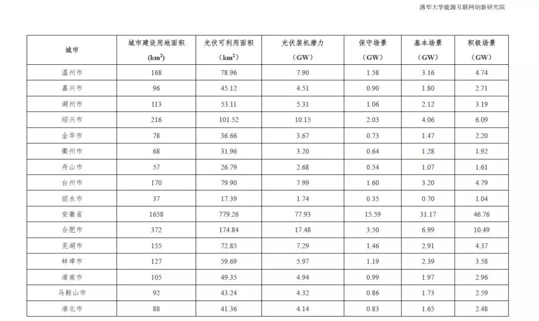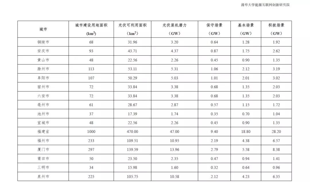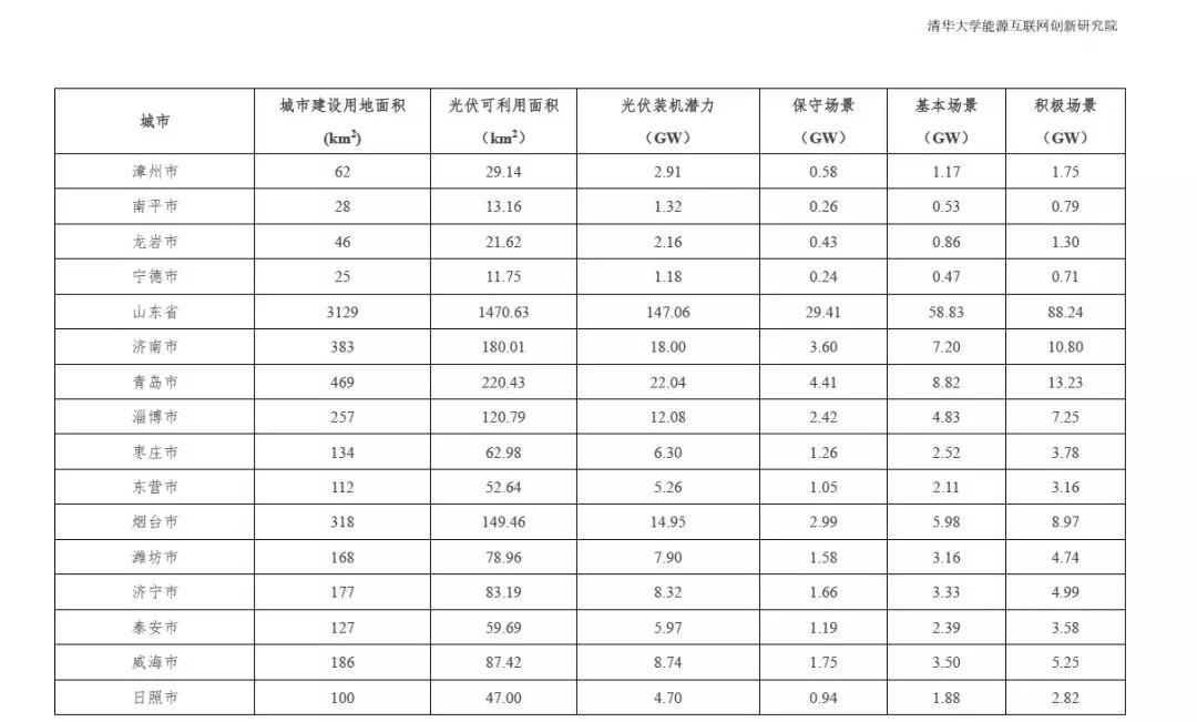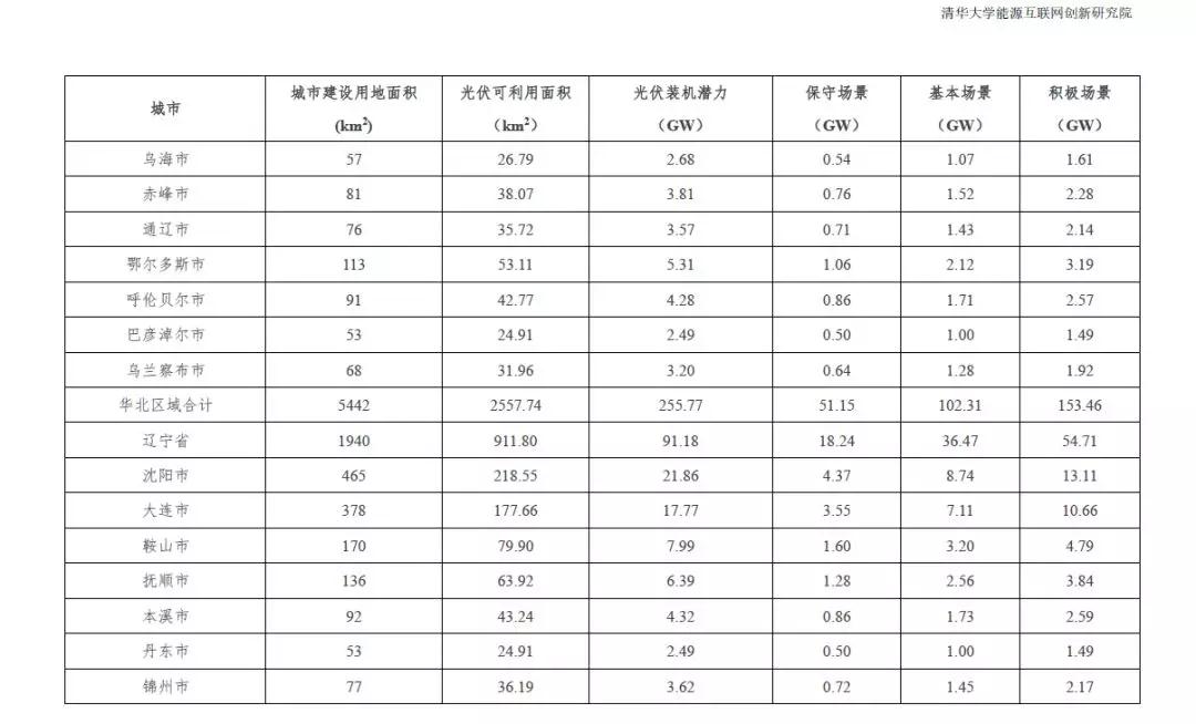 根据2015中国城市统计年鉴-城市建设用地状况报告,结合本报告2.1.4中顺义区分布式光伏资源测算研究成果,利用公式(1)的城市分布式光伏资源评估模型,得到全国31个省市可利用光伏面积统计数据。