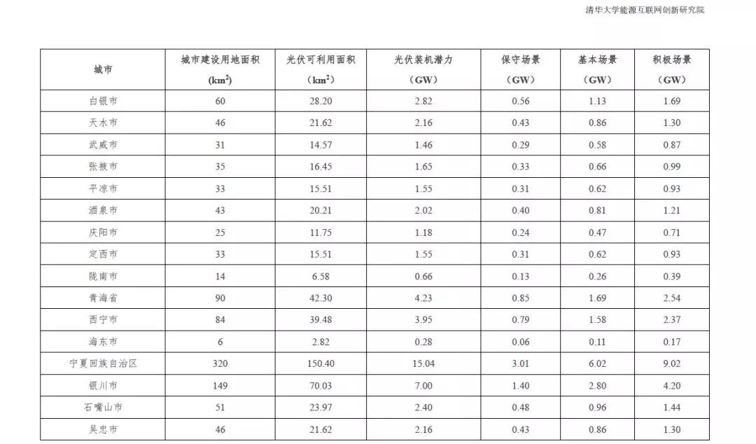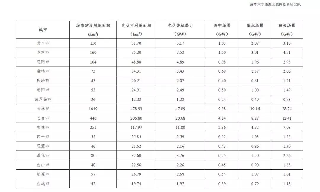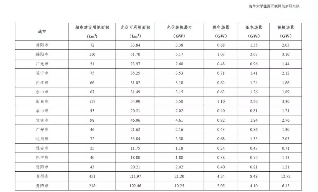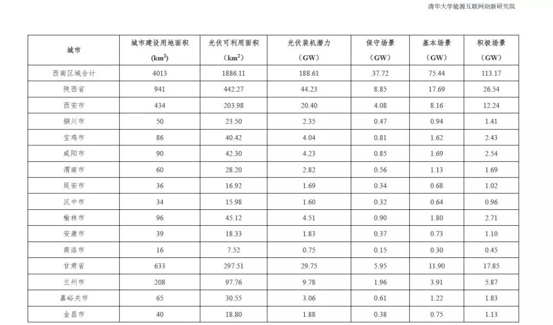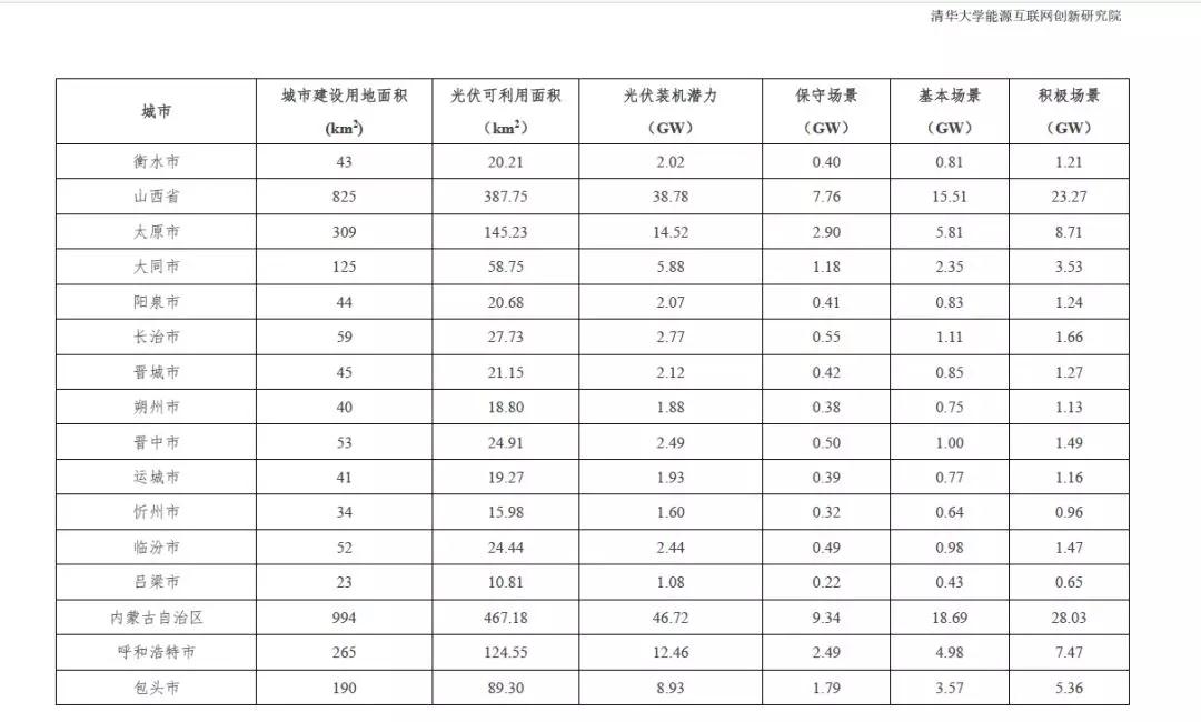 根据2015中国城市统计年鉴-城市建设用地状况报告,结合本报告2.1.4中顺义区分布式光伏资源测算研究成果,利用公式(1)的城市分布式光伏资源评估模型,得到全国31个省市可利用光伏面积统计数据。