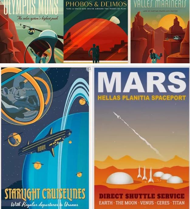 随后,老马又大打情怀牌,随手贴出了几张颇具年代感的太空海报,随图配文更是简单直接——“Mars Awaits”。