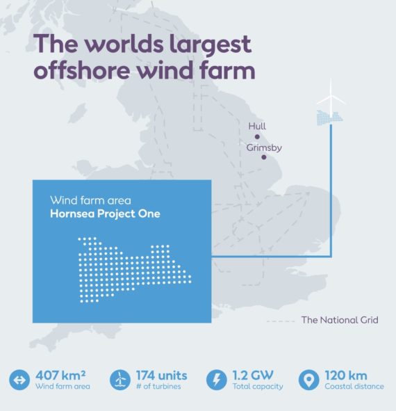丹麦海上风力发电公司Ørsted(前身是东能源)已经开始建设Hornsea Project One海上风电场,装机容量达到1.2吉瓦,建成后,这将成为世界上最大的海上风电场。