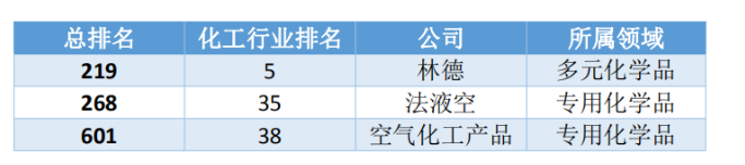 气体产品是现代工业重要的基础原料,属于化工领域。上表显示,林德、法液空、空气化工产品在2000家上市公司中分别排在了第219、第268、第601名,在化工行业中分别排在了第5、第35、第38位。