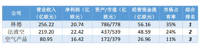 根据以上数据,林德无论总资产还是市值均为最高,三家公司总资产及市值排名依次为林德、法液空、空气化工产品。