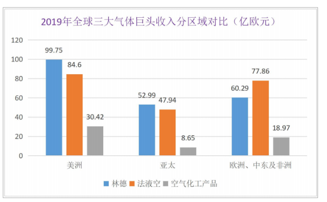 在亚太地区,林德依然是领头羊,2019年在该地区的收入达到了52.99亿欧元,法液空2019年在该地区收入为47.94亿欧元紧随其后,排名最后的为空气化工产品。