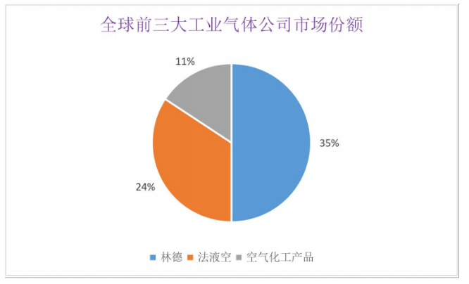 公开资料显示,林德市场份额为35%,全球最大;紧随其后的依次为法液空和空气化工产品,分别占24%、11%,日本太阳日酸、德国梅塞尔气体、中国盈德气体等其它气体公司占据剩余30%的市场。