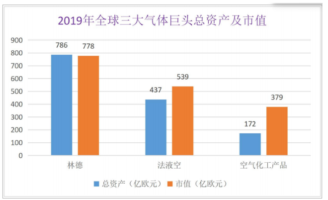 法液空集团2019年总资产为437亿欧元,市值为539亿欧元;空气化工产品2019年总资产为172亿欧元,市值为379亿欧元。