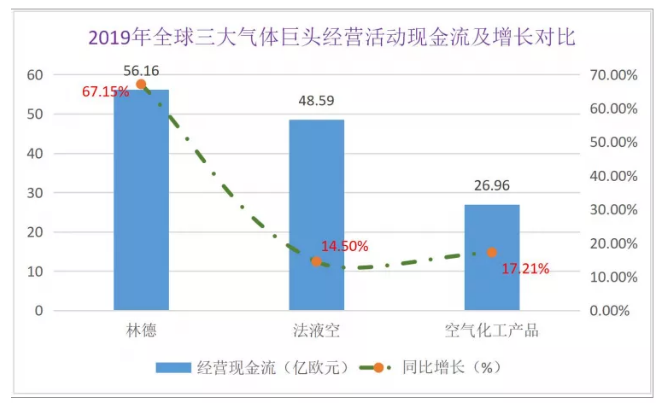 林德与普莱克斯合并后公司规模大幅增加,因此其经营活动带来的现金流涨幅较大,2019年达到56.16亿欧元,相较2018年增长67.15%,在三家公司中排名第一。