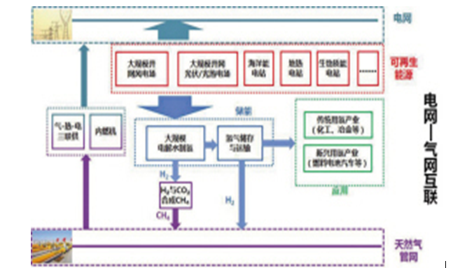 电—氢—燃料电池发电:将可再生能源电解产生的氢能经压缩储存后,在用电高峰时供给燃料电池系统发电,回送电量至电网,若将燃料电池的热能回收再利用,综合能效可达60%以上。