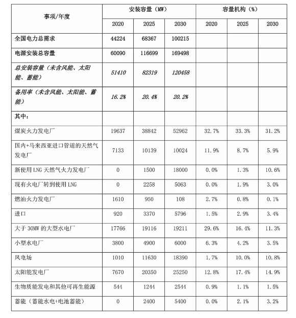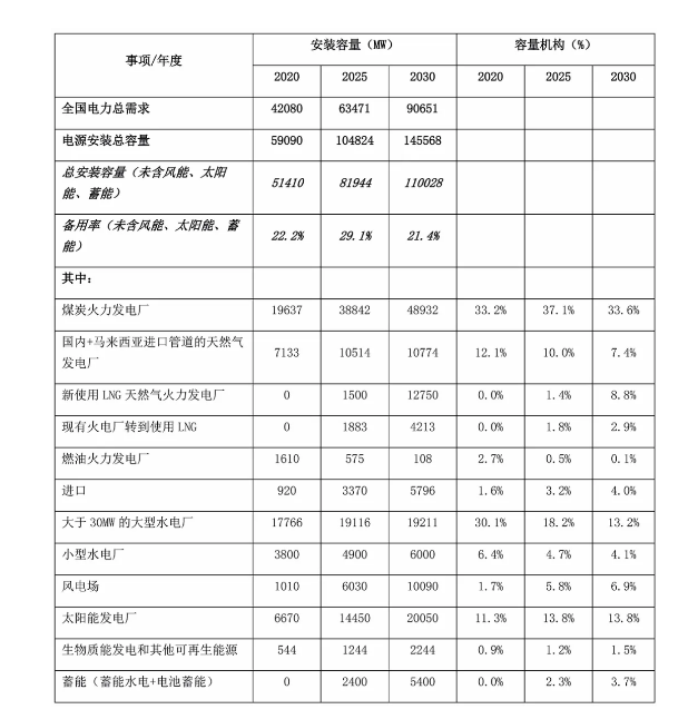 表格1:2020-2030年电源容量结构初步方案(1931/BCT-DL)