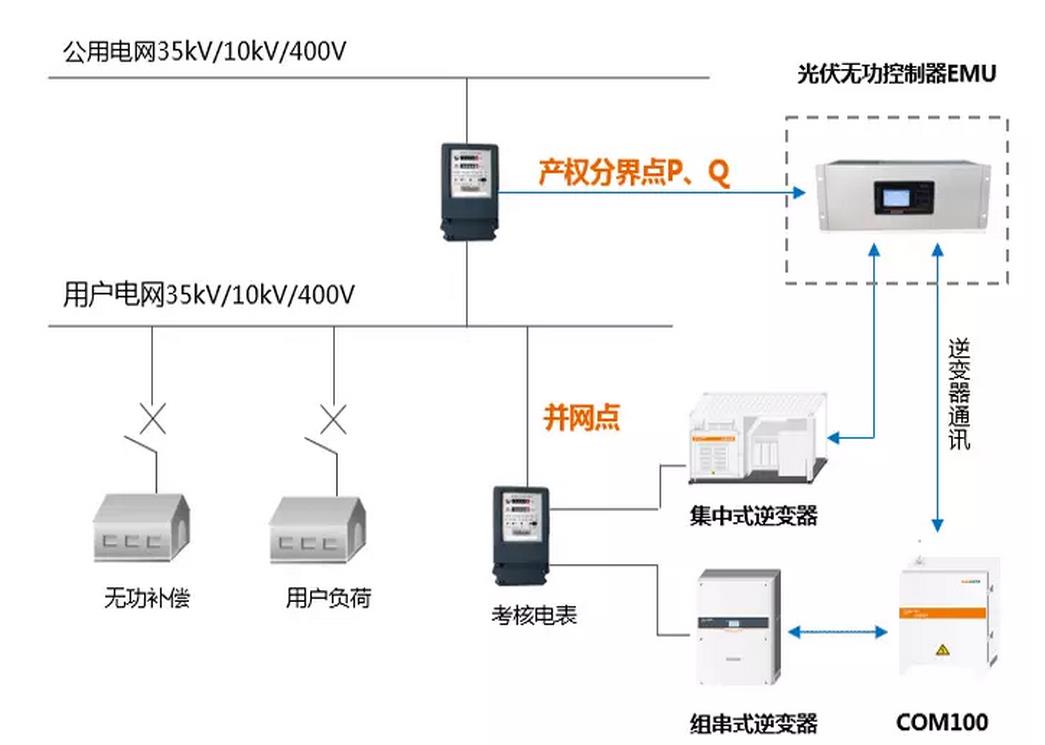 智慧阳光分布式电站无功控制解决方案,在光伏系统中安装无功控制器EMU,实时采集产权分界点的P、Q,与预先设置的目标功率因数进行比较分析,计算出产权分界点所需的无功,并以广播的方式快速给每台逆变器下发指令,通过逆变器发出无功,来调节产权分界点的功率因数,保证厂区功率因数实时满足电网公司要求,不影响厂区的电能质量以及厂区的有功发电,保证电网安全。