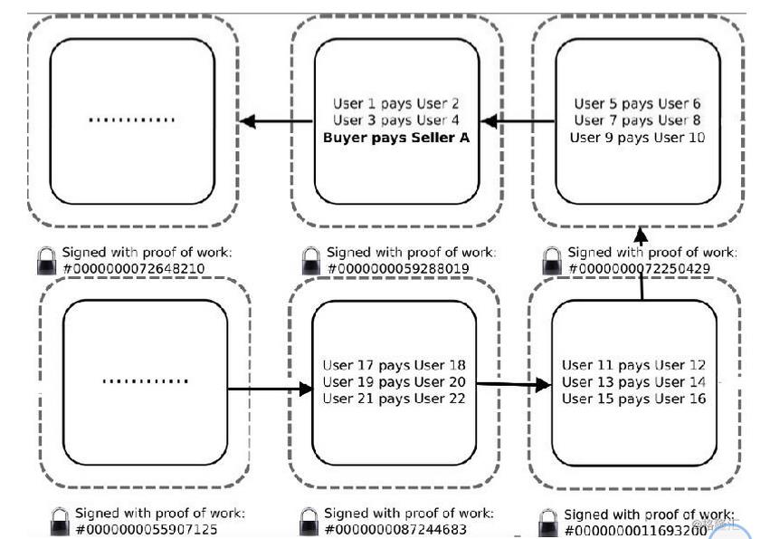 每次晚上谁洗了碗(工作量证明)之后就可以在公共账本上结账,而且洗碗还有报酬,必须在前一天大家都公认的账本后面添加新的交易,而且其他人也会参与验证当天的交易。