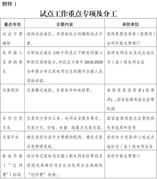 为进一步明确分布式发电市场化交易试点方案编制的有关事项,在《国家发展改革委 国家能源局关于开展分布式发电市场化交易试点的通知》(发改能源〔2017〕1901号)基础上,现对试点组织方式及分工、试点方案内容要求、试点方案报送等补充通知如下: