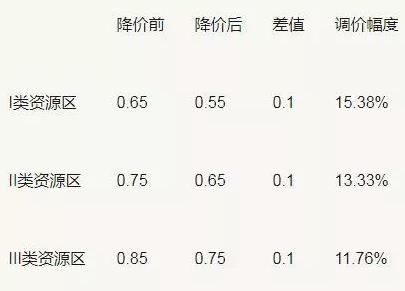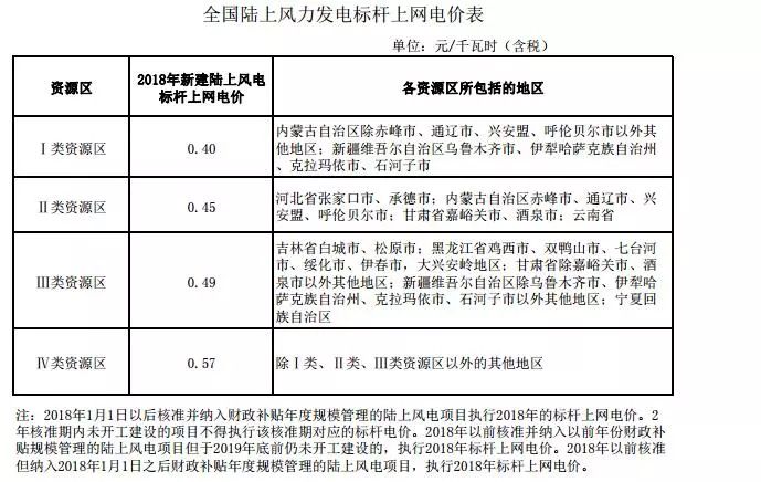 根据去年发改委发布的关于调整陆上风电标杆上网电价的通知,2018年1月1日之后,一类至四类资源区新核准建设陆上风电标杆上网电价分别调整为每千瓦时0.40元、0.45元、0.49元、0.57元,比2016-2017年电价每千瓦时降低7分、5分、5分、3分。