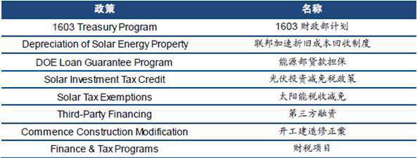 美国光伏行业政策主要有两大类:联邦财政激励计划和法律法规、标准、约束性指标等管理类政策。其中,联邦财政激励计划并不局限于补贴,而是以税收优惠为主,并对税收、贷款、担保等各项投融资流程均有惠及,旨提高光伏行业的投资驱动力。