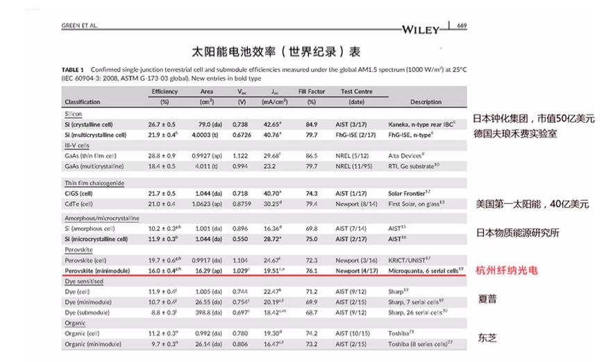 据了解,钙钛矿是一种廉价的人工合成材料,在2009年首次被尝试应用于光伏发电领域后,从此大放异彩。相比于晶硅、铜铟镓硒、碲化镉等传统的光伏材料,钙钛矿材料不仅具有同样优异的光电性能,且原料来源丰富,成本低廉,其制造成本有望达到目前晶硅太阳能电池的1/3到1/5,因而显示出巨大的商业价值。全球顶尖科研机构和大型跨国公司如牛津大学、瑞士洛桑联邦理工学院、日本松下、夏普等近年都投入了大量人力物力,力争早日实现量产。2017年其还被列为诺贝尔化学奖的热门提名领域。