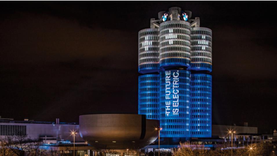 为了庆祝这一里程碑,宝马位于在慕尼黑的总部被照亮,看起来像四个直立式电池。