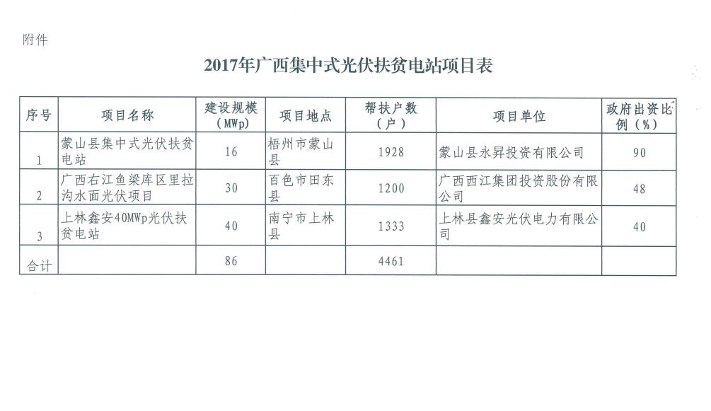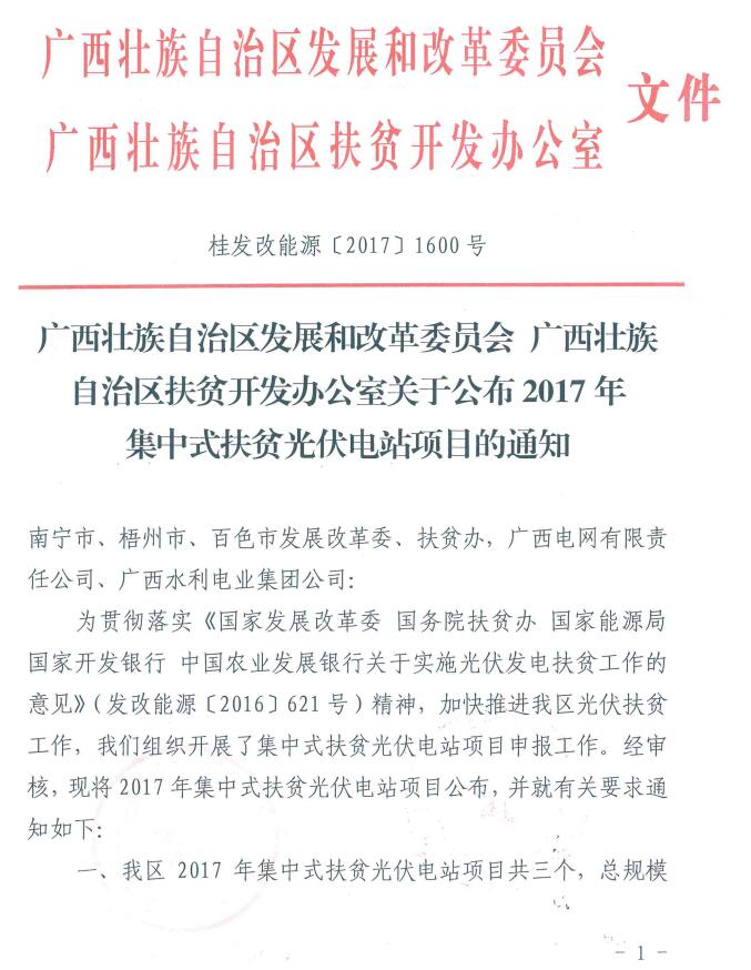 12月14日,广西壮族自治区发展和改革委员会广西壮族自治区扶贫开发办公室公开发布了《关于公布2017年集中式扶贫光伏电站项目的通知 (桂发改能源〔2017〕1600号)》,详细文件如下: