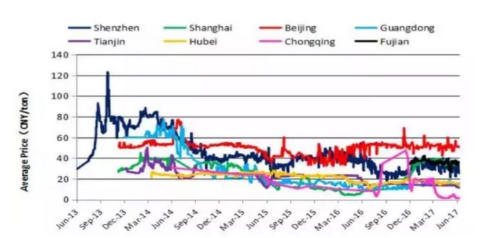 中国碳市场试点碳价每日平均价格(元/吨),2013年6月18日-2017年6月30日)图片来源:中国碳论坛《2017年中国碳价调查》