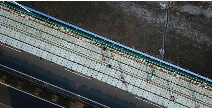 “光伏路面通过收集到的太阳能转化为电能,从而实现太阳能发电。”提供核心技术的同济大学交通运输工程学院教授张宏超告诉记者,该路面使用的技术被称为承载式光伏路面技术,是将符合车辆通行条件的光伏发电组件直接铺设在道路路面上,路面表层被称为“透明混凝土”,其技术指标和通行安全系数均超过当前普遍使用的沥青混凝土路面。光伏发电组件到底是啥?简单地说,就是和太阳能电池板一样,不过要满足路面使用,强化了抗压、抗滑的性能。 图片来源:视觉中国