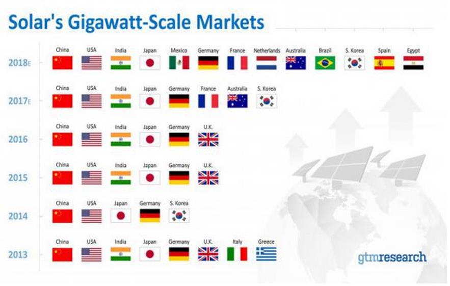 2018年13个国家将跻身全球吉瓦级太阳能市场