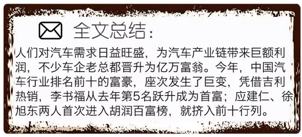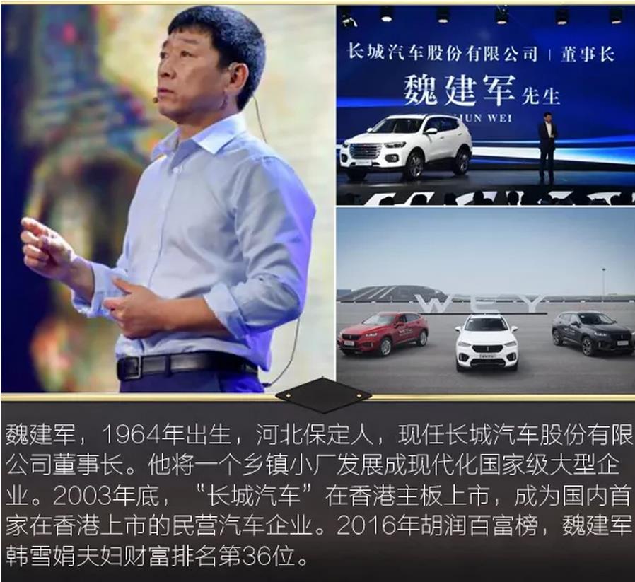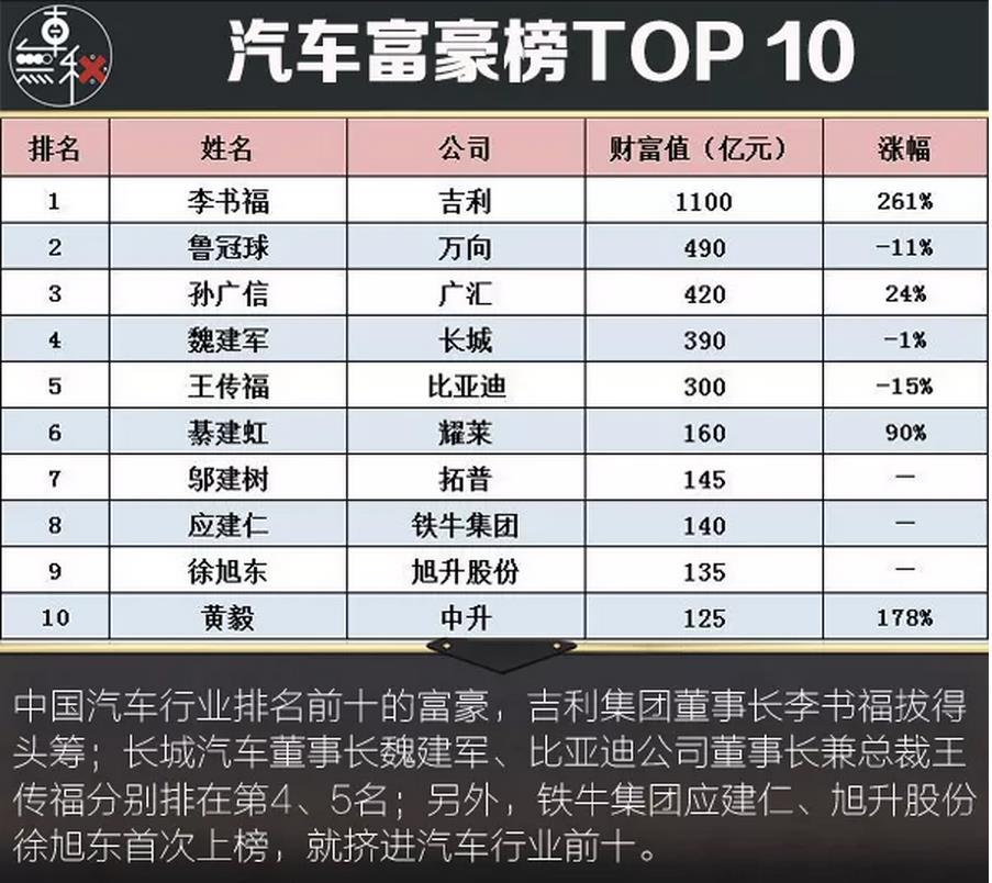 随着国内汽车产业的飞速发展,不少企业家晋升为亿万富翁,最近胡润研究院发布了《36计•胡润百富榜2017》。中国汽车行业TOP 10的富豪们,有不少大家熟悉的车企老总,包括吉利集团-李书福、长城汽车-魏建军、比亚迪汽车-王传福等等。汽车圈真正的首富到底是谁呢?