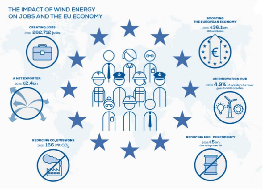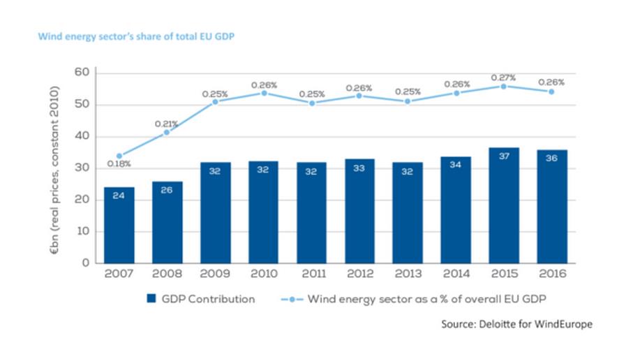 尽管如此,2016年,欧洲风能产业为欧盟GDP创收361亿欧元,占欧盟GDP总量的0.26%。