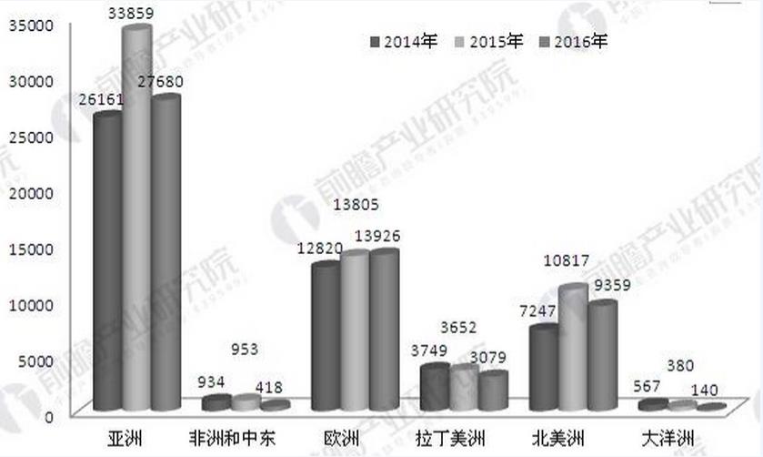 2014-2016年全球风电新增装机区域结构(单位:MW)