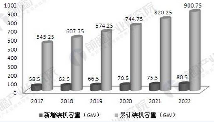 因此,根据近几年全球各国风电新增装机量和累计装机量的情况,可以得出2017-2022年的市场情况,预计到2022年,全球风电累计装机量达900.75GW。