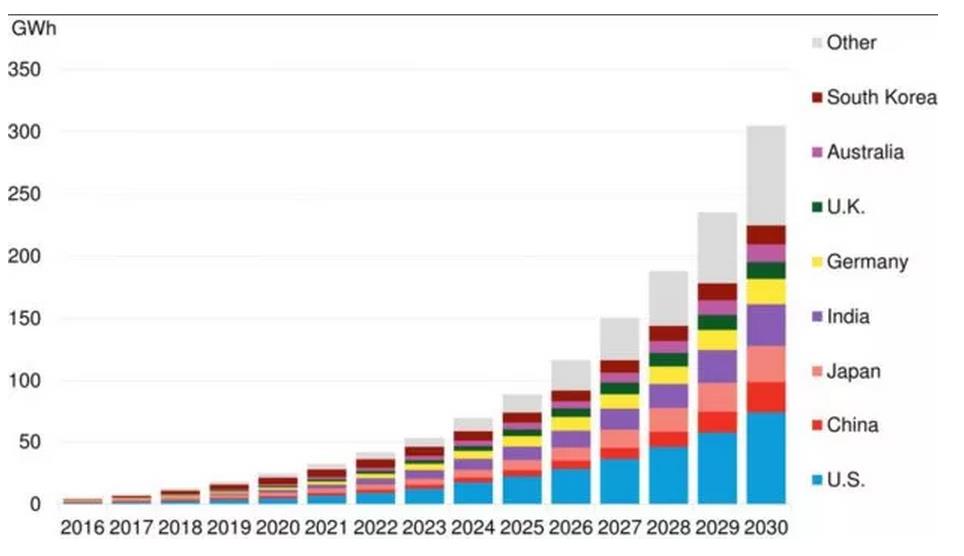 BNEF周一公布的2017 - 2030年度储能预测报告显示,2016年至2030年间,全球能源存储市场不仅将翻倍,而且美国将占据四分之一的部署。