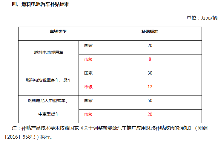 意见稿规定,2017年1月1日起注册登记的车辆,为国家补贴的50%;燃料电池汽车地方补贴不低于4500元/kW(根据车辆燃料电池额定功率计算单车补贴额),地方补贴额不超国家补贴。
