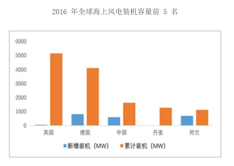 随着海上电价政策的明确,建设成本的持续优化以及配套产业的日渐成熟,我国海上风电在“十三五” 期间迎来加速发展期,规划目标是到 2020年确保并网 5GW,力争开工 10GW。截至 2016 年底我国海上风电累计装机容量为 1.63GW, 预测未来三年半新增海上风电并网将达 3.37GW 以上,新增海上风电项目开工 8.37GW 以上。2016 年我国海上风电累计装机容量超过丹麦排在全球海上风电累计装机榜单第三位,紧随英国和德国。
